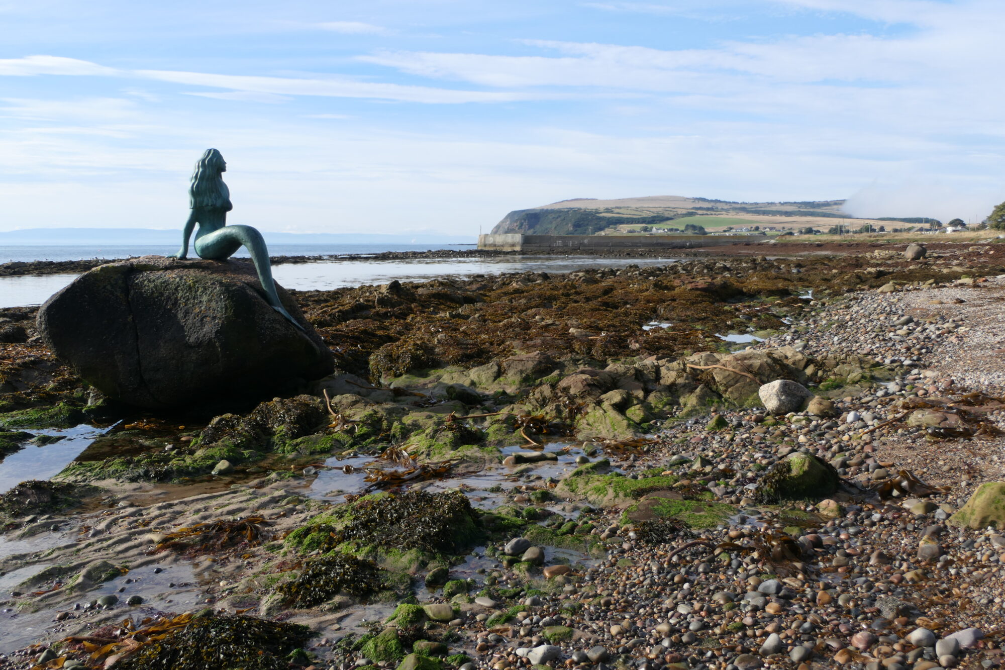 Vandaag starten we dus echt met de NC500, maar maken we gelijk een ommetje om aan de oostkust “The Mermaid of the North” te zien. Een beeld, nu op het droge omdat het eb is, van een zeemeermin. Het verhaal is dat Donnel haar vroeger vond en haar staart afknipte en jaren met haar heeft geleefd en kinderen met haar kreeg. Zij zou haar staart op gegeven moment gevonden hebben en er toen vandoor zijn gegaan. Een korte tussenstop dus.