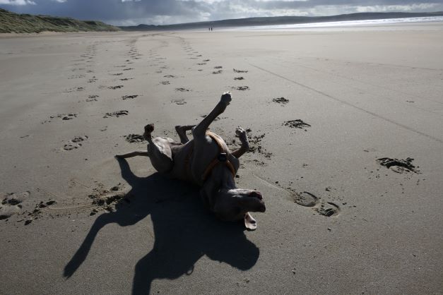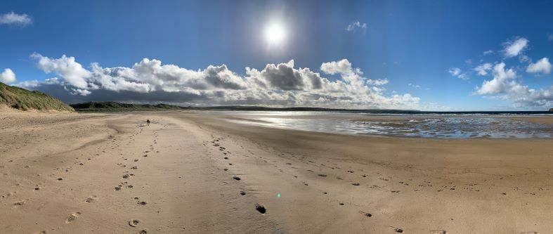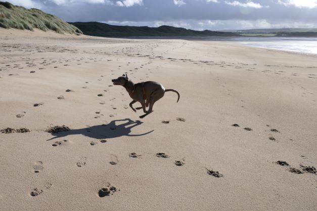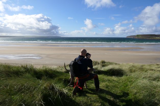 We rijden naar Dunnet Forest voor een wandeling, een klein (lijkt aangelegd) naaldboombosje. Dat grijze monstertje kan nog wel een goede wandeling gebruiken en wij ook. Tegenover de parkeerplaats van het bos zien we ook een olifantenpaadje richting duinen/strand, een beter idee. Deze pakken we en we maken een mooie korte wandeling met wat hoogteverschil door de duinen en zien een pad naar het strand. Een prachtige strandwandeling waar Silver ook erg van geniet en rondjes rent alsof hij een jonge hond is.