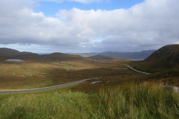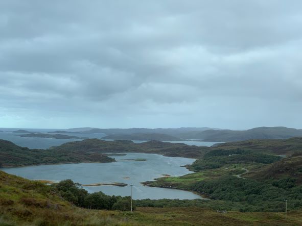 Onze eerste stop was de Kylesku bridge, hier regende het nog, dus het uitzicht was niet geweldig. Daarna kwamen we langs de Wailing Widow Fall, een uitzichtpunt op 3 miezerige watervalletjes, na een fotootje rijden we verder. De weg splitst zich hierop, wij gaan verder op een stuk van de NC500 waar motorhomes en bussen niet op kunnen. Dit belooft veel single track wegen :-).