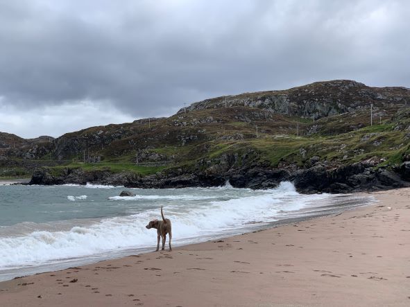 Onderweg stoppen we voor de Clashnessie Fall, een hele mooie waterval waar we via een korte, modderige, rotsachtige wandeling komen. Iets hiervoor zien we een strandje, Clashnessie Bay/Beach en was even de benen en pootjes strekken een goed idee.