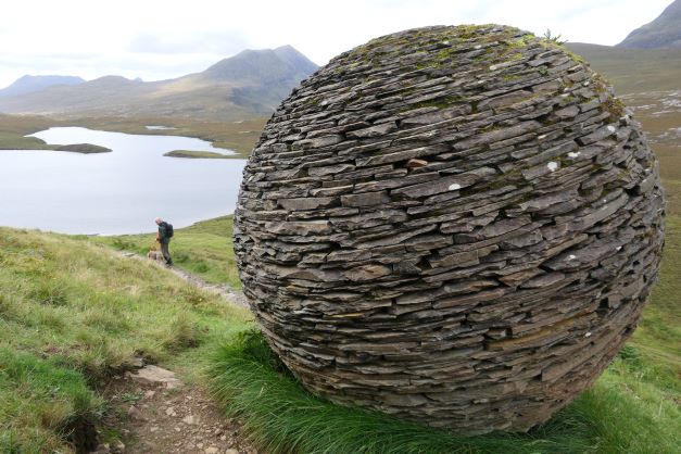 Nog iets verderop maken we een korte wandeling naar Knockan Crag, 2 km, maar wel met ca 185 hoogtemeter. De paden zijn smal en soms heb je aan de ene kant de afgrond en aan de andere kant een steile berg omhoog. Silver geeft er niks om en loopt op de randjes met z’n neus in de lucht.