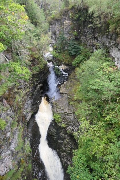 Onze laatste tussenstop is bij een hangbrug bij Corrieshalloch Gorge. Hier mag je met 6 personen op en het wiebelt behoorlijk. De Gorge is mooi en de hangbrug is precies boven de waterval.
