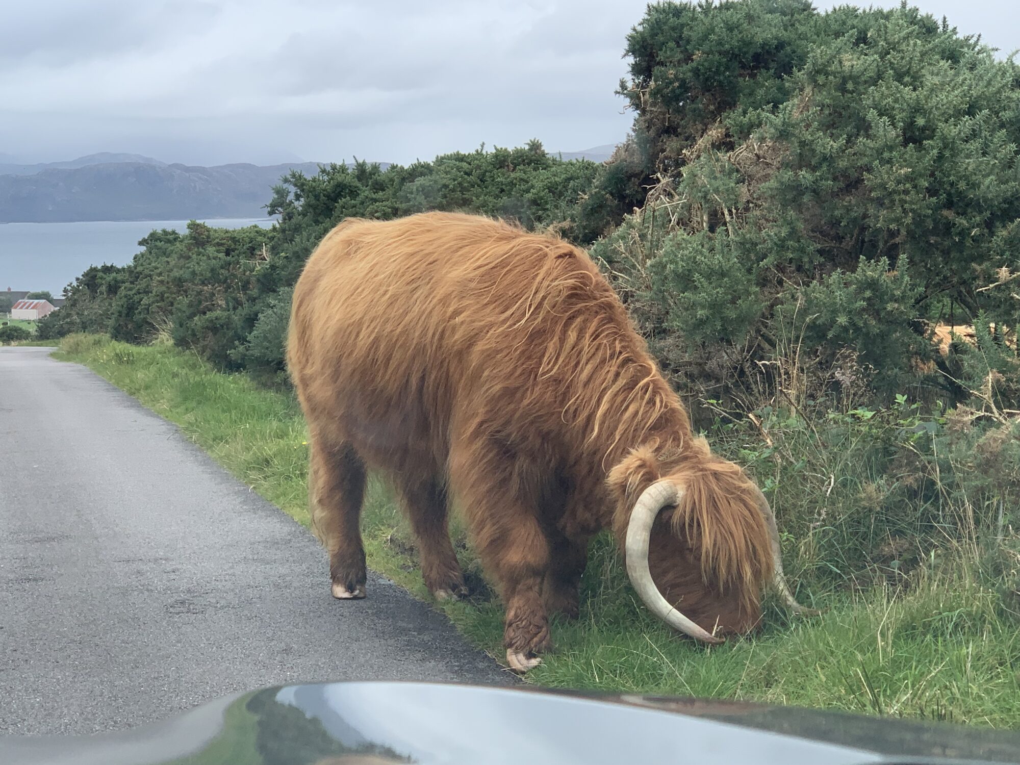 Onderweg komen we op een singletrack-weggetje nog een mooie schotse Hooglander tegen. De teller staat inmiddels op ca 20-25. Het aantal gewone runderen is nog steeds vele malen hoger dan het aantal Schotse Hooglanders dat we hebben gezien…