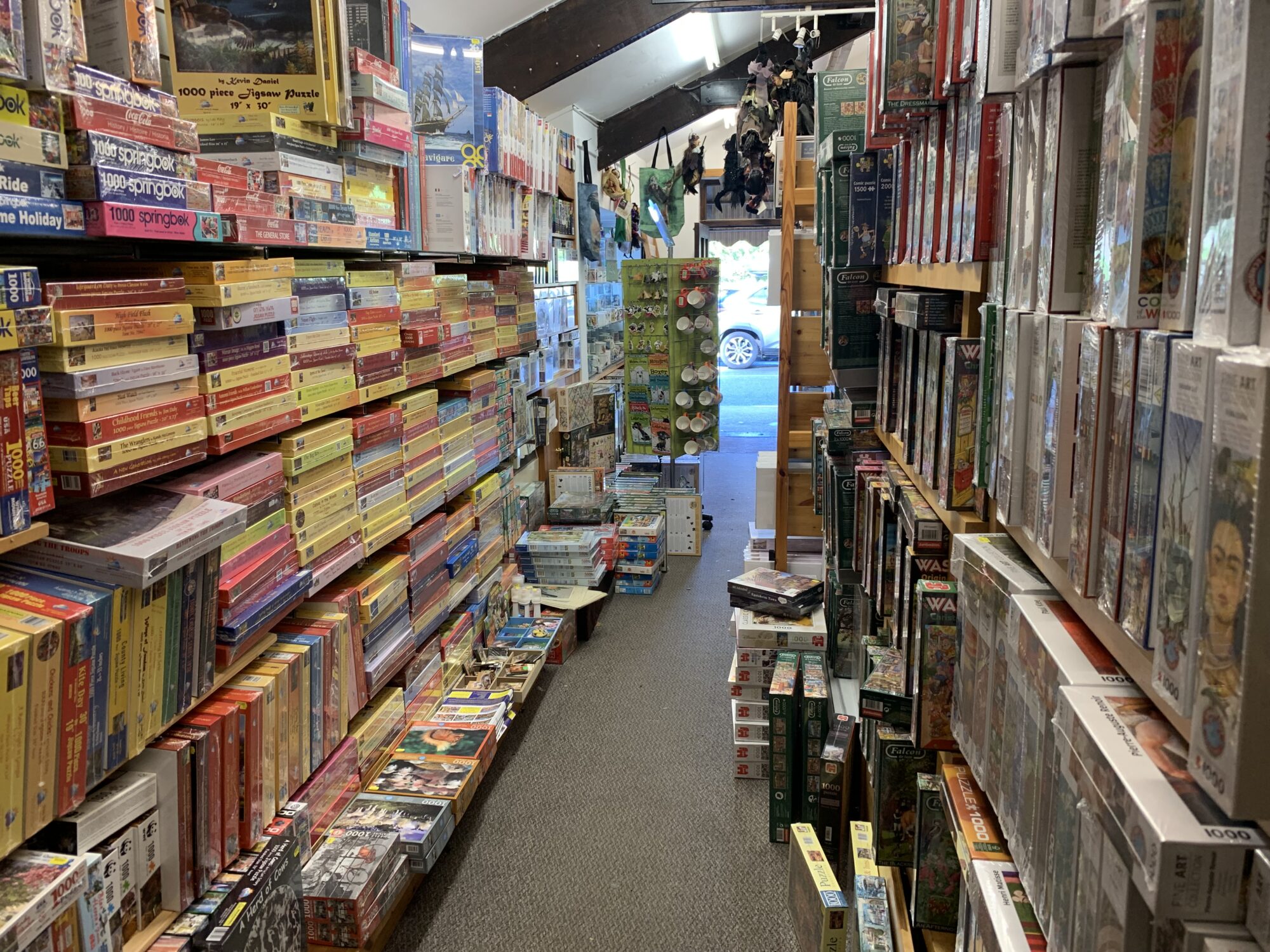 In Grasmere slagen we niet voor de boodschappen (stone-cole English jargon: buttscoops). Wel vinden we naast de Co-op Food een winkeltje wat het walhalla van legpuzzels lijkt te zijn, Barney’s Newsbox. Stapels puzzels en rijen vol. Op de foto één van de vele gangen.