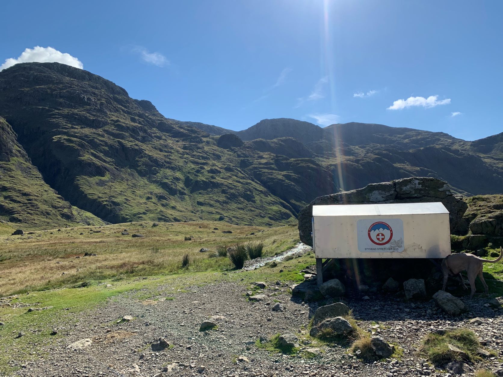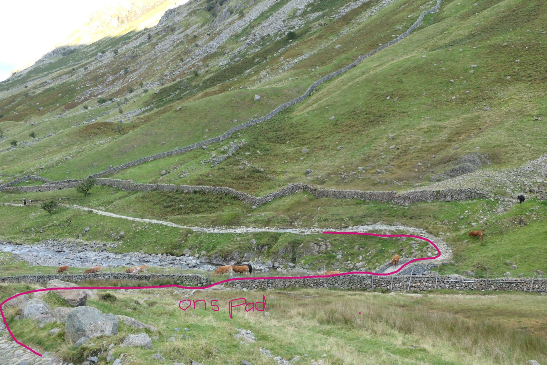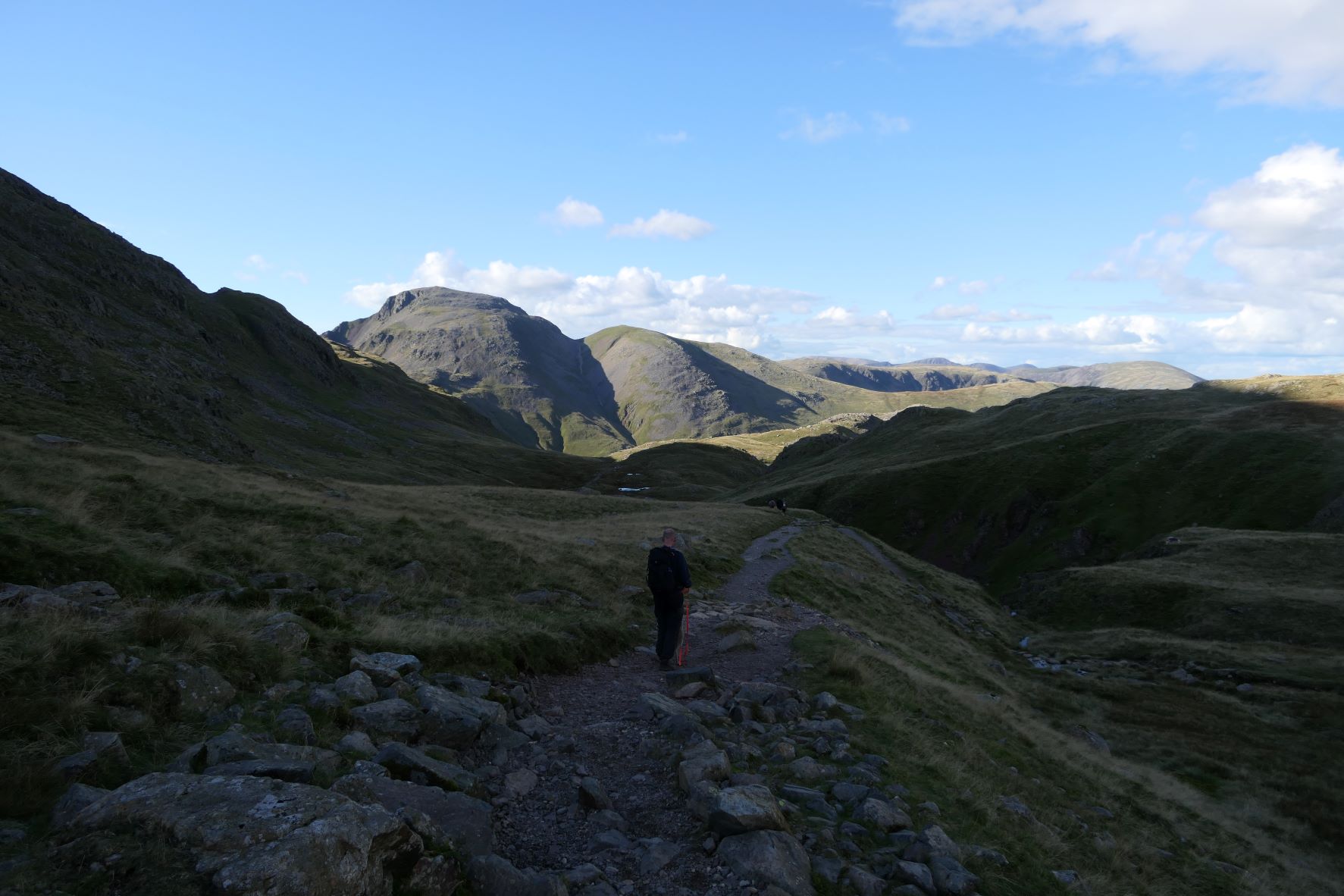 We gaan onderweg naar Scafell Pike, de hoogste berg in Engeland waarvan de top ligt op bijna 1000 meter. We starten op een hoogte van ca. 150 meter en moeten om daar te komen dus 850 hoogtemeter overbruggen. Uit de verschillende routes omhoog hebben we een vrij lange gekozen (17km) omdat de andere routes of te uitdagend waren (vraag of Silver daar überhaupt mee zou kunnen) of veel te steil 850 hoogtemeter in 4,5 km, bijna continu een stijgingspercentage van 35-40%.