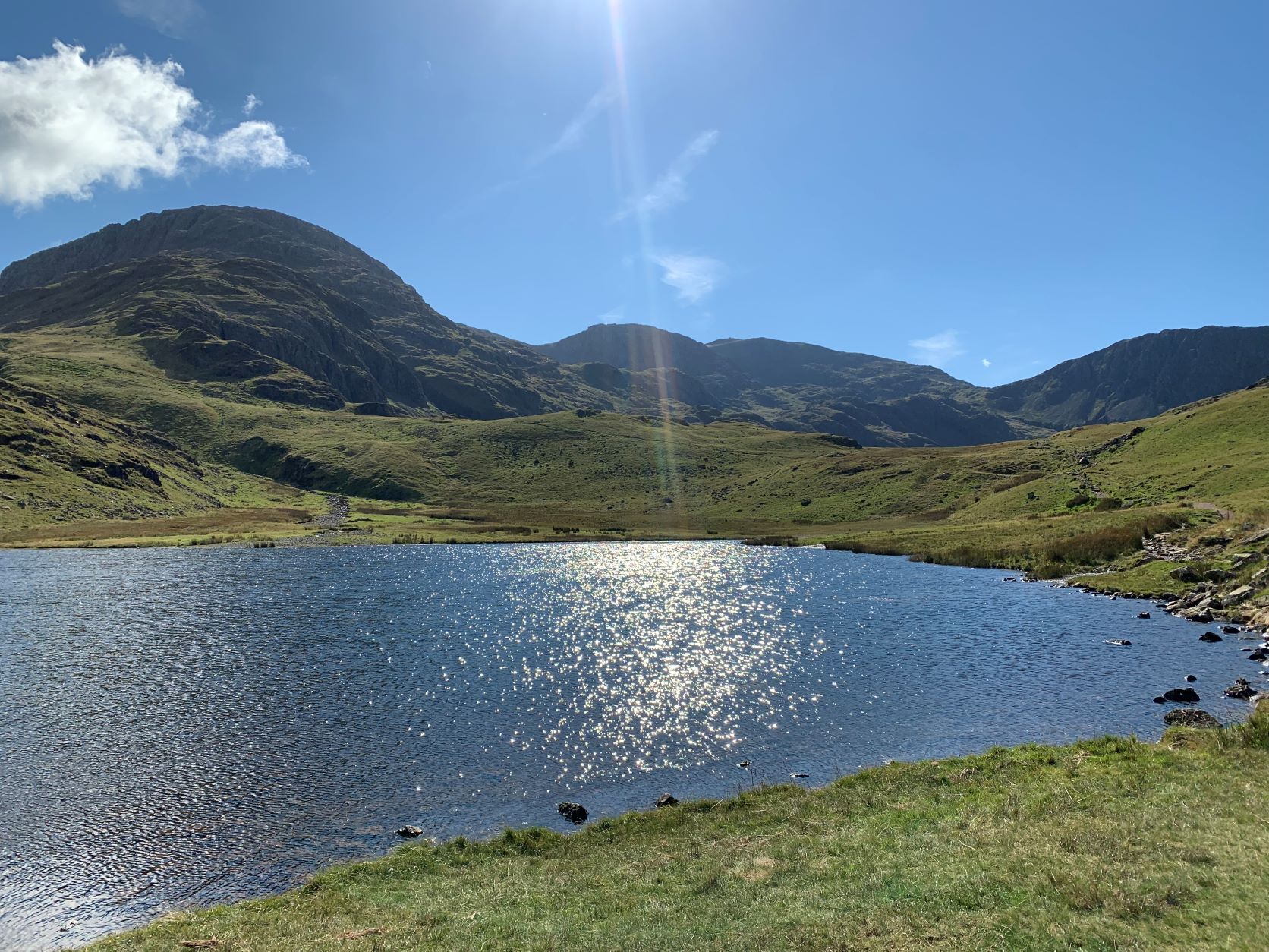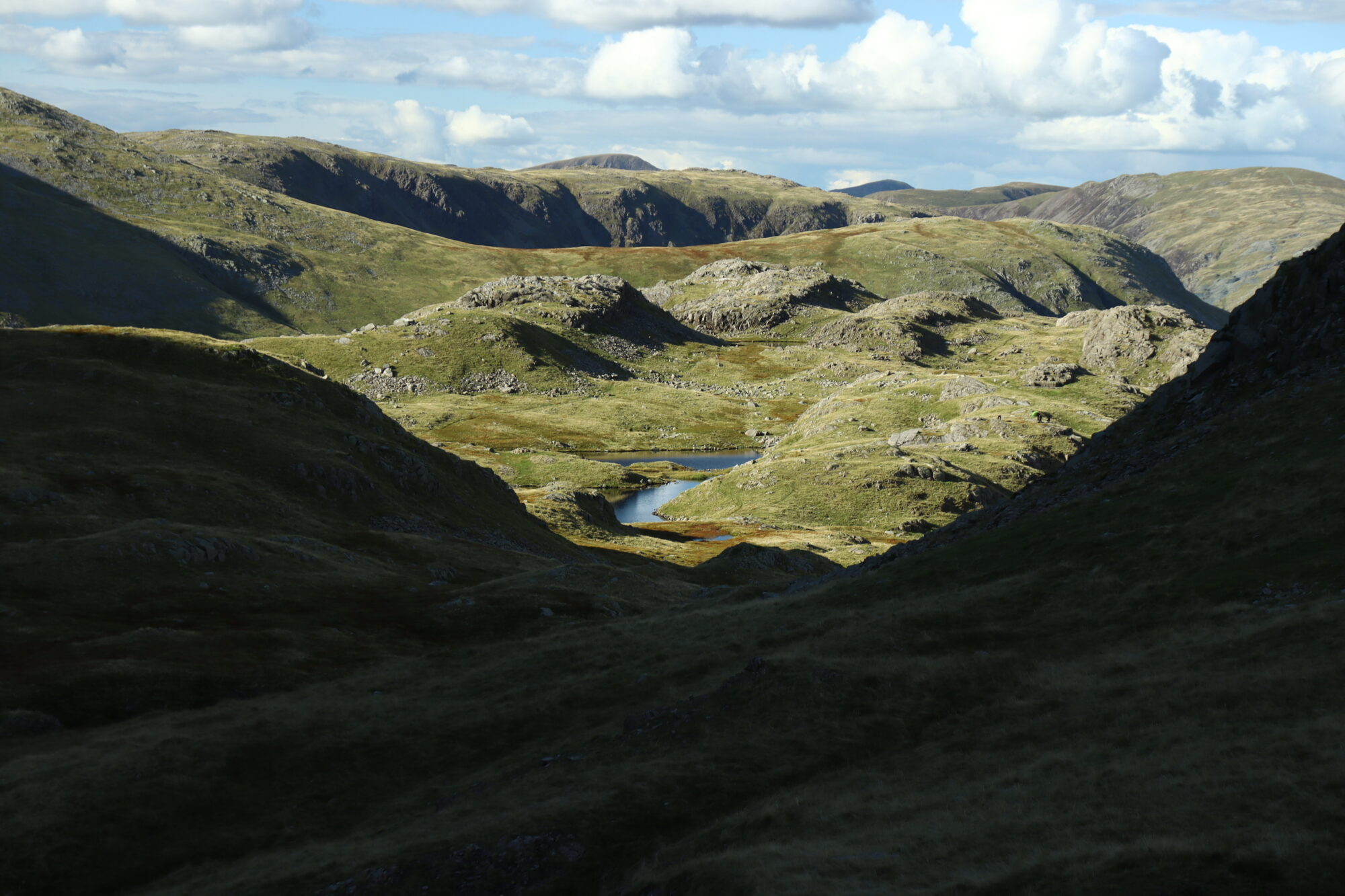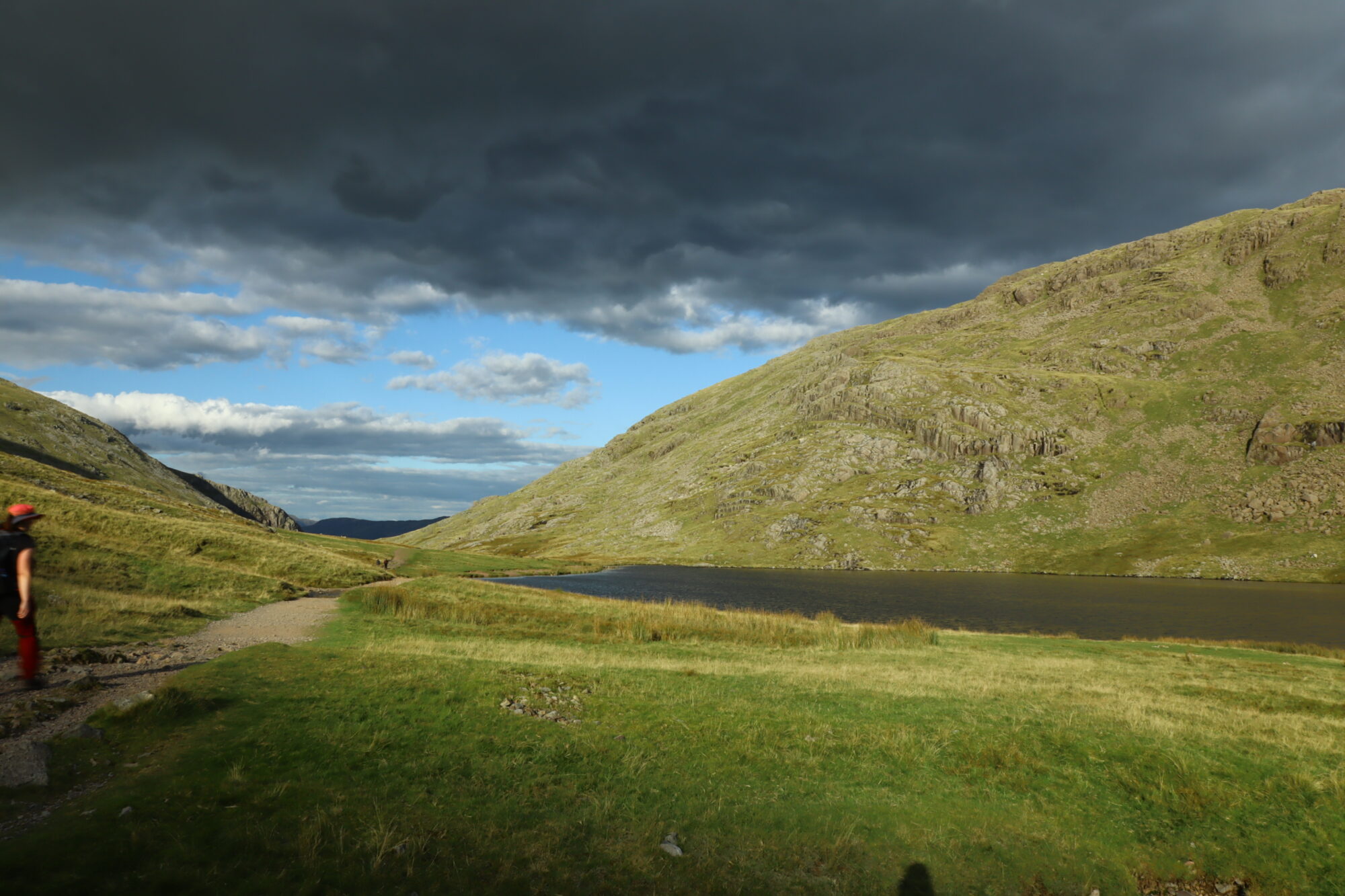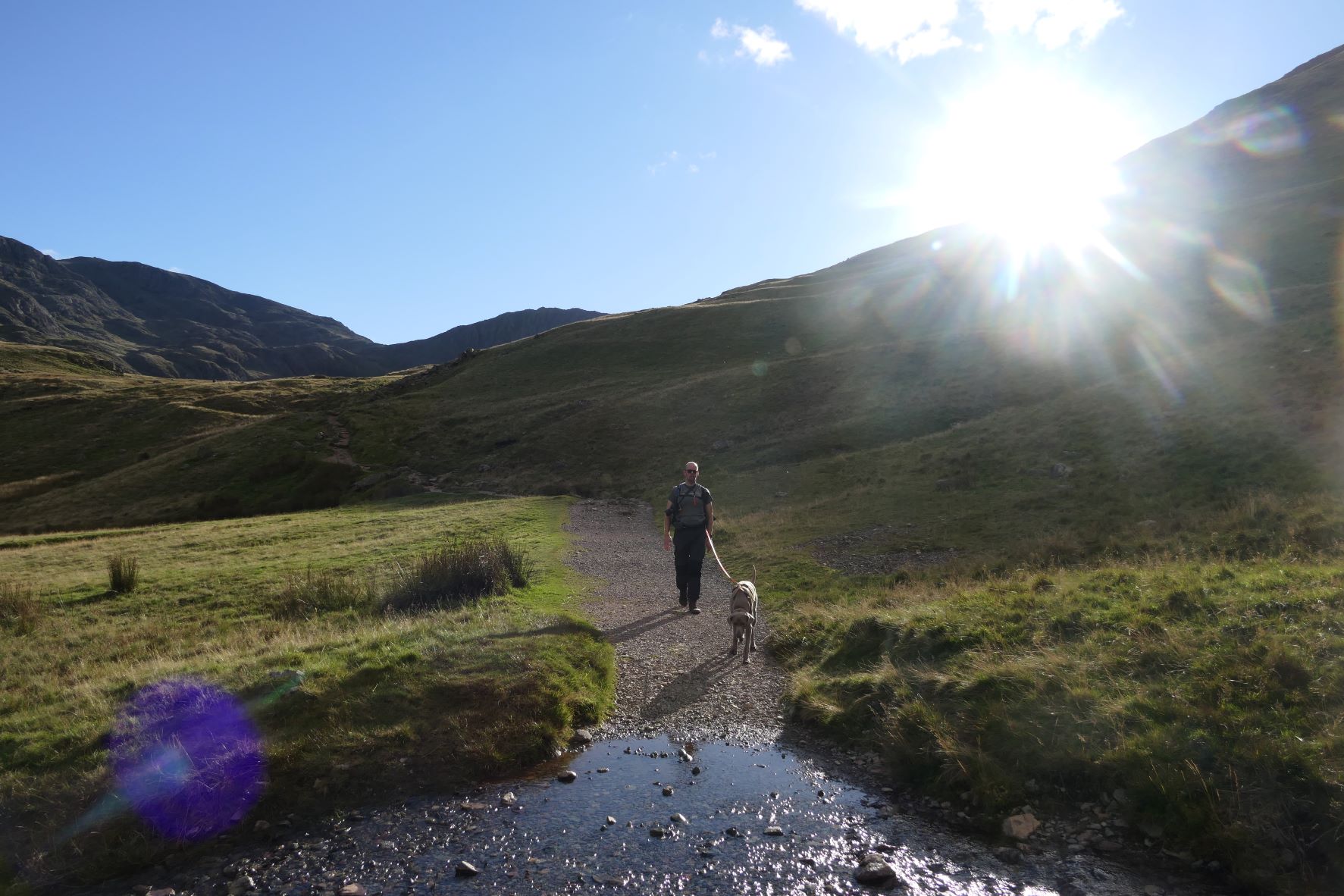 We zijn blij als we Silver heelhuids van het rotsblokkentraject af hebben, nemen de tijd voor wat foto’s en beginnen aan de ruim 8,5 km lange afdaling. Een behoorlijke aanslag op onze spieren, pezen en gewrichten. Het terrein maakt het extra uitdagend. We krijgen beide pijntjes in onze voeten, rug, gewrichten etc.. Toch niet helemaal gewend zulke tochten te maken. We vragen ons ook af hoe het voor Silver zou zijn, die lijkt zo makkelijk te lopen en zelfs op het einde van de wandeling heeft hij nog de energie om initiatief te te tonen richting schaapjes. En ook onderweg terug komen we bij één van de bergmeertjes een paar kinderen tegen die stenen in dat bergmeertje gooien, Silver had maar al te graag met hen gespeeld en die stenen opgehaald.