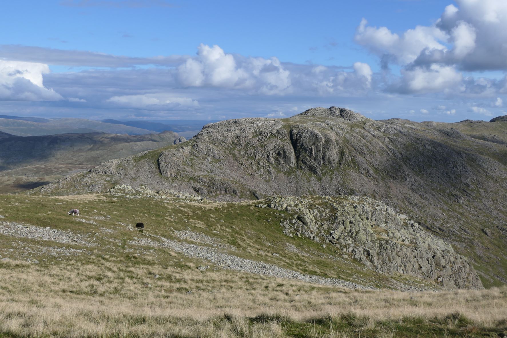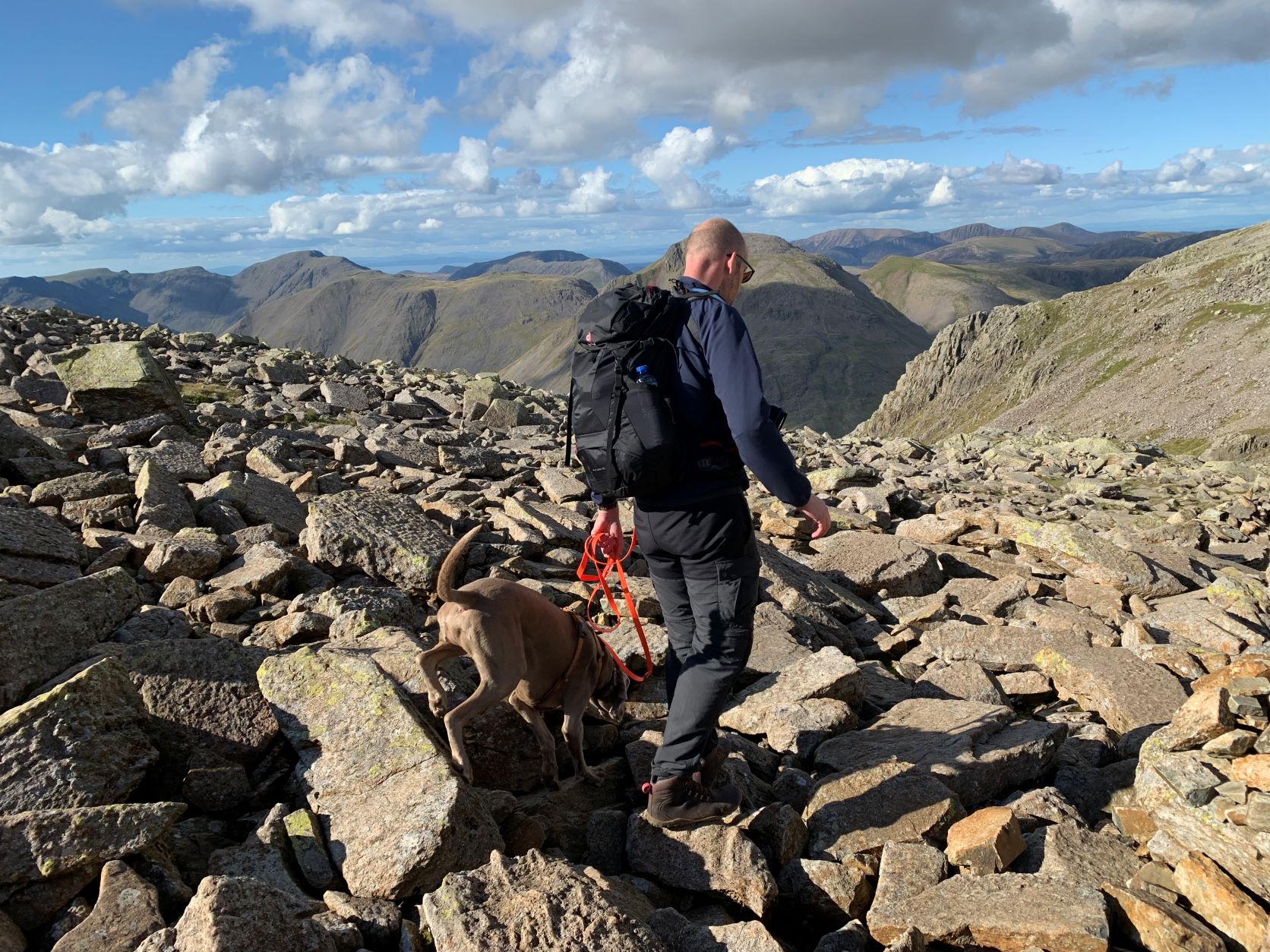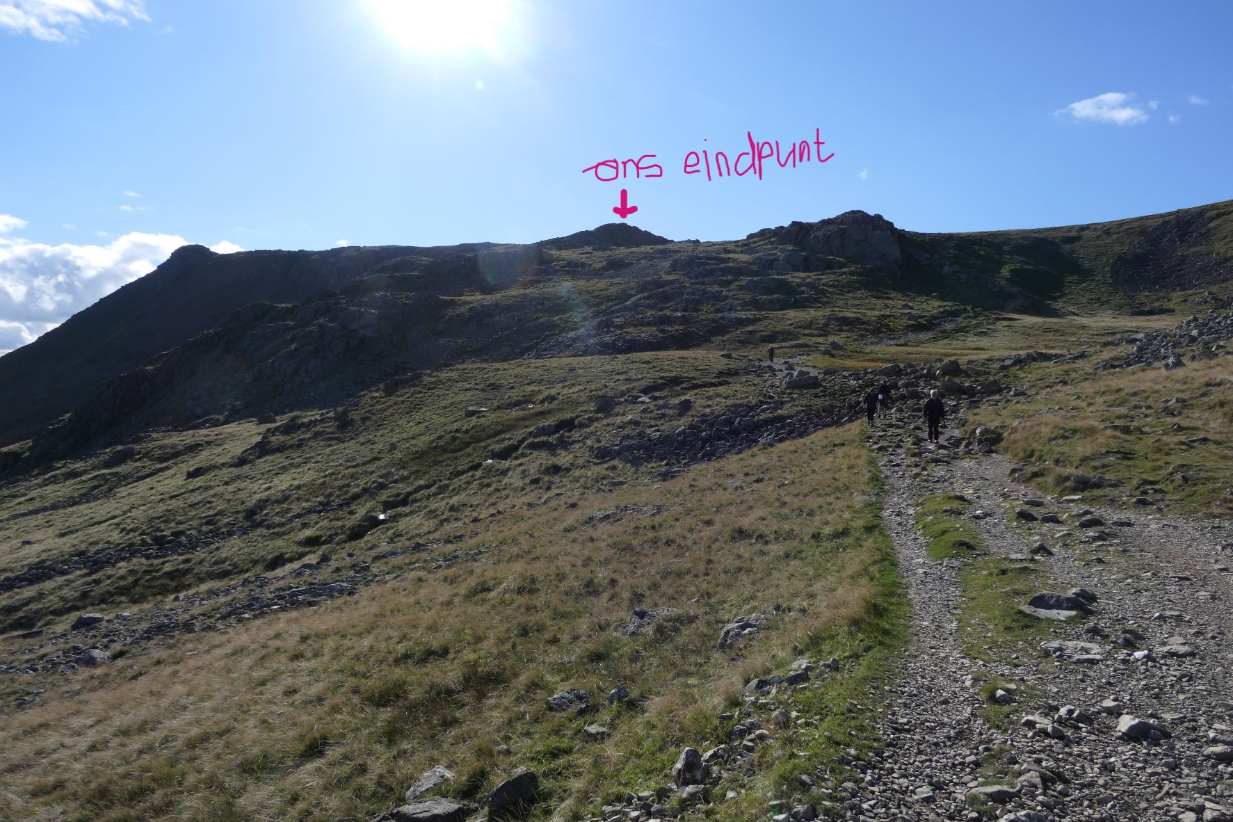 Na ca. 4 uur komen we aan bij Scafell Pike. We beginnen aan het laatste stuk, het is nog een paar 100 meter met weinig hoogteverschil, wel heel veel rotsblokken met losliggende stenen en hier is het ook wat drukker. Drie wandelroutes komen hier bijeen. Eigenlijk is dit laatste stuk voor Martijn en Petra niet heel zwaar, maar Silver heeft moeite met z’n vier voeten overal goed te plaatsen. En tussen de rotsblokken in zitten overal spleten waar hij met z’n pootjes in kan glijden met risico op blessures. Halverwege is hij inmiddels twee keer weggezakt met een pootje in zo’n gat en vinden we het risico op blessures voor hem te groot en keren we terug. De mierenhoop vinden we daar ook niet fijn. Op 15 hoogtemeters en ca 300 meter na waren we op de top. Maar het punt waar we omdraaiden ervaarden wij als de top van England, wat een uitzicht en wat een plek. Hoe dan ook een mooie prestatie en beloond met mooie vergezichten.